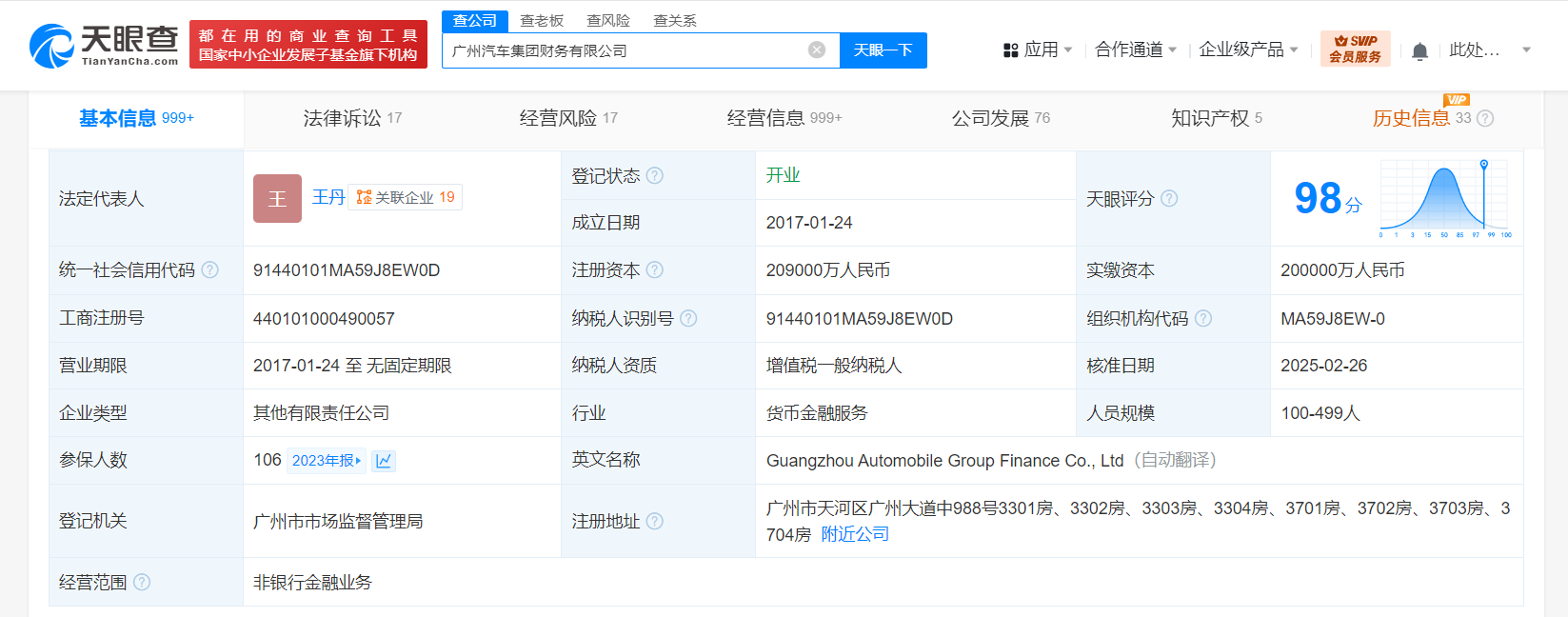 该公司成立于2017年1月,法定代表人为王丹,经营范围为非银行金融业务。股东信息显示,该公司由广汽集团(601238)及旗下广汽传祺汽车有限公司、广汽商贸有限公司共同持股。