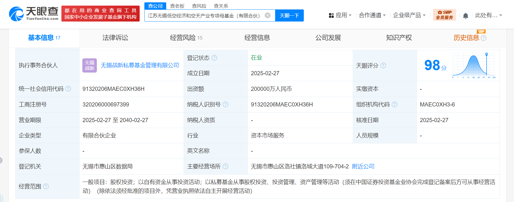 天眼查App显示,近日,江苏无锡低空经济和空天产业专项母基金(有限合伙)成立,执行事务合伙人为无锡战新私募基金管理有限公司,出资额20亿人民币,经营范围为股权投资,以自有资金从事投资活动,以私募基金从事股权投资、投资管理、资产管理等活动。合伙人信息显示,该基金由江苏省战略性新兴产业母基金有限公司、无锡市交通产业集团有限公司、无锡新洛本源创业投资合伙企业(有限合伙)、无锡苏南国际机场集团有限公司等共同出资。