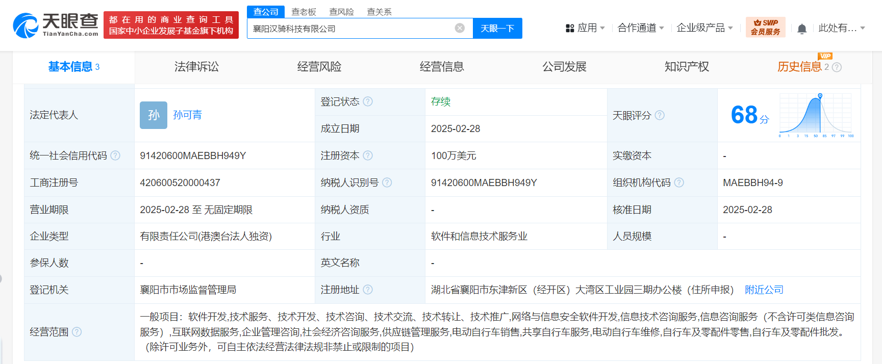 天眼查App显示,近日,襄阳汉骑科技有限公司成立,法定代表人为孙可青,注册资本100万美元,经营范围含软件开发、网络与信息安全软件开发、信息技术咨询服务、信息咨询服务、互联网数据服务、企业管理咨询、社会经济咨询服务、供应链管理服务等。股东信息显示,该公司由美团旗下Xigua Limited全资持股。