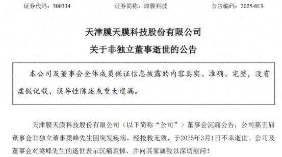 3月2日晚间,津膜科技(300334)发布公告称,公司第五届董事会非独立董事梁峰因突发疾病,经抢救无效,于2025年3月1日不幸逝世。