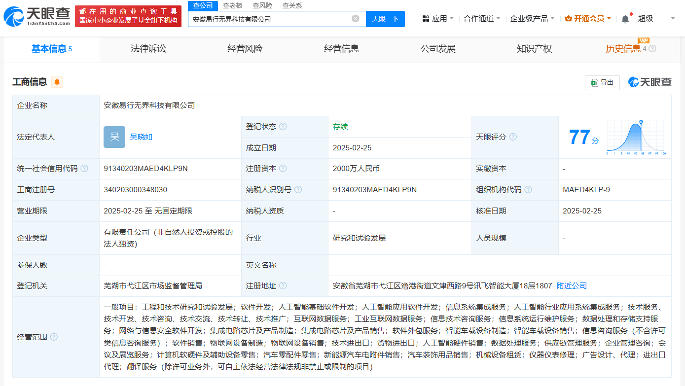 天眼查App显示,近日,安徽易行无界科技有限公司成立,法定代表人为吴晓如,注册资本2000万人民币,经营范围包括软件开发、人工智能基础软件开发、人工智能应用软件开发、集成电路芯片及产品制造、智能车载设备制造等。股权全景穿透图显示,该公司由科大讯飞旗下江苏易行智联汽车科技有限公司全资持股。