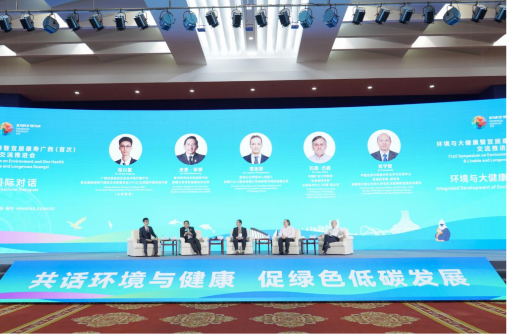 2024年5月18日,张兴赢(左一)在环境与大健康暨宜居康寿广西交流推进会上主持国际对话会。新华社发