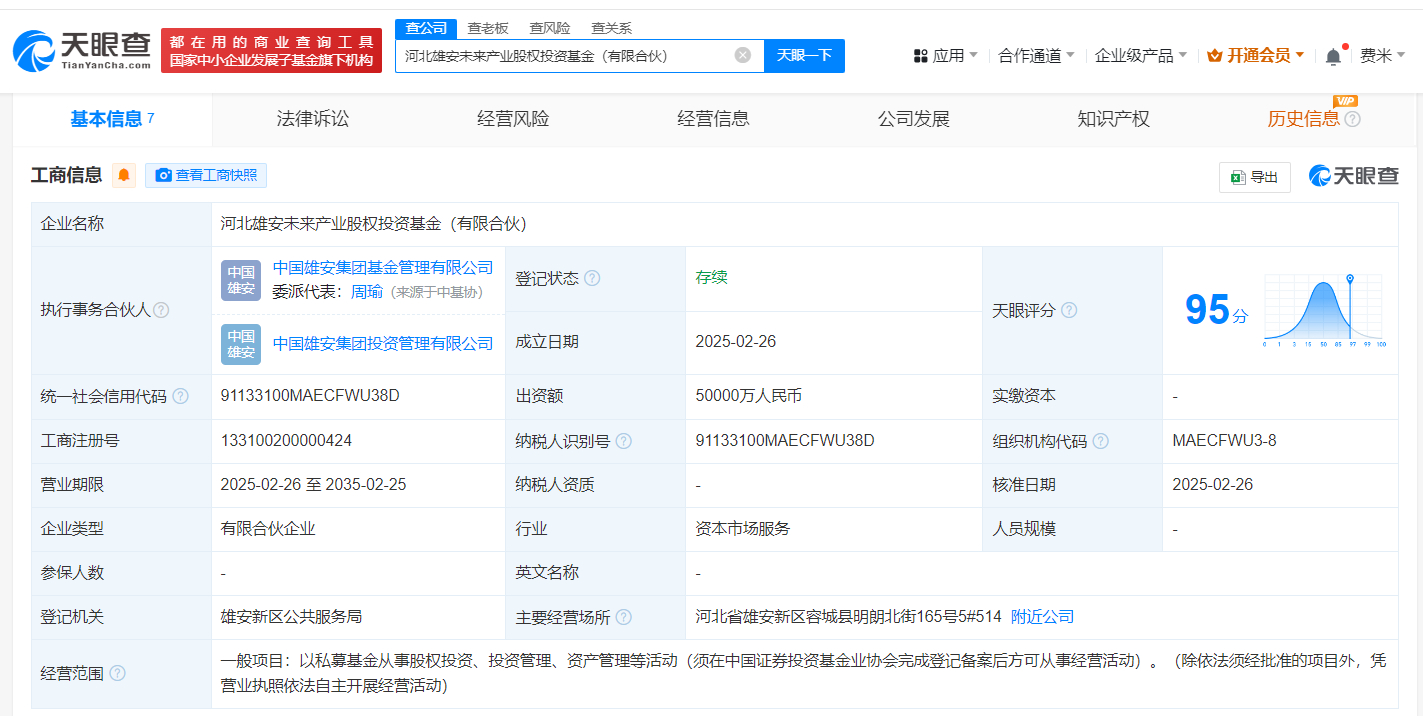 天眼查App显示,近日,河北雄安未来产业股权投资基金(有限合伙)成立,执行事务合伙人为中国雄安集团基金管理有限公司、中国雄安集团投资管理有限公司,出资额5亿人民币,经营范围为以私募基金从事股权投资、投资管理、资产管理等活动,由中国雄安集团投资管理有限公司、中国雄安集团城市发展投资有限公司、雄安雄商发展有限公司和中国雄安集团基金管理有限公司共同出资。