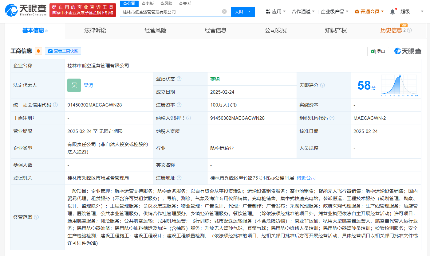 天眼查App显示,近日,桂林市低空运营管理有限公司成立,注册资本100万人民币,经营范围包括企业管理、航空运营支持服务、航空商务服务、以自有资金从事投资活动、智能无人飞行器销售等。股东信息显示,该公司由桂林投资控股集团有限公司全资持股。