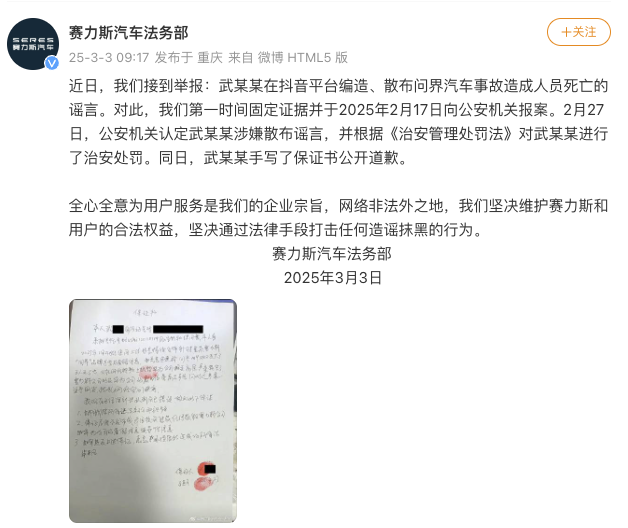3月3日,赛力斯汽车法务部发文:近日,我们接到举报,武某某在抖音平台编造、散布问界汽车事故造成人员死亡的谣言。对此,我们第一时间固定证据并于2025年2月17日向公安机关报案。2月27日,公安机关认定武某某涉嫌散布谣言,并根据《治安管理处罚法》对武某某进行了治安处罚。同日,武某某手写了保证书公开道歉。