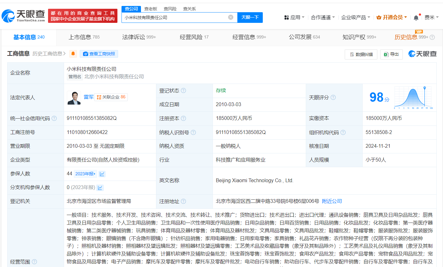 天眼查知识产权信息显示,近日,小米科技有限责任公司登记“Xiaomi EV Ultra Club”作品著作权,作品类别为美术。