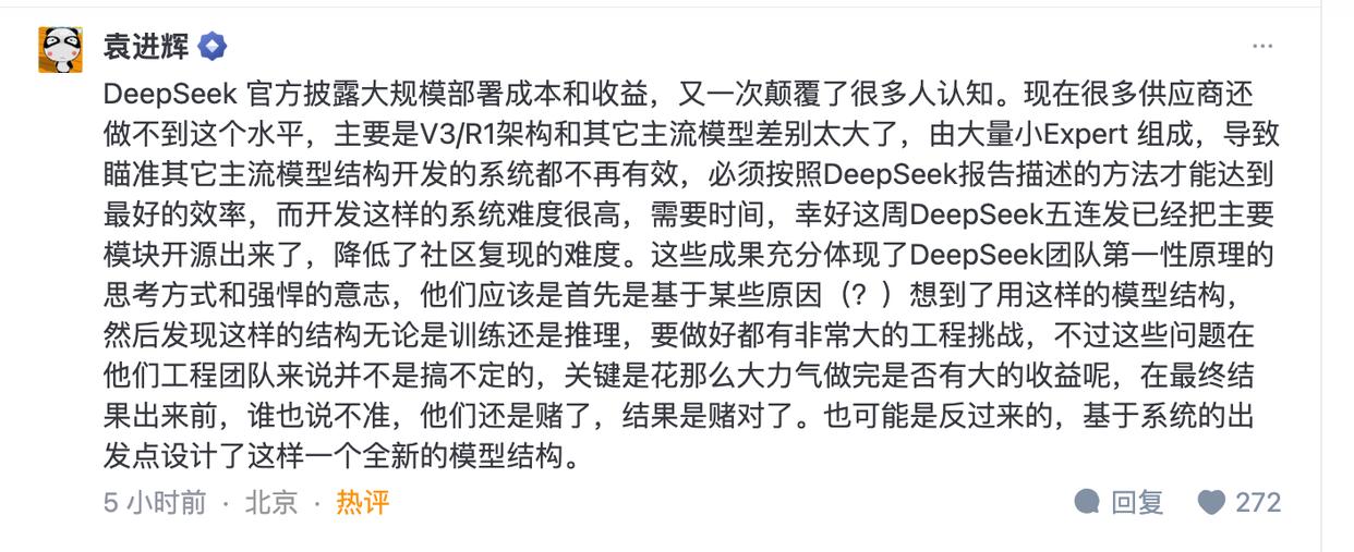 袁进辉提到,现在很多供应商做不到这个水平,主要是V3/R1架构和其它主流模型差别太大了,由大量小Expert (专家)组成,导致瞄准其它主流模型结构开发的系统都不再有效,必须按照DeepSeek报告描述的方法才能达到最好的效率,而开发这样的系统难度很高,需要时间,而这周“DeepSeek五连发”已经将主要模块开源出来了,降低了社区复现的难度。