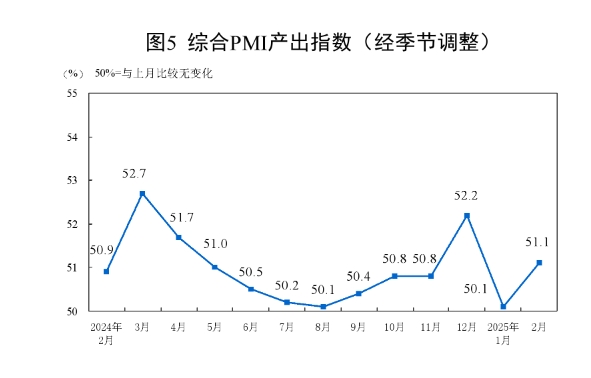 2月份,综合PMI产出指数为51.1%,比上月上升1.0个百分点,表明我国经济景气水平总体回升。