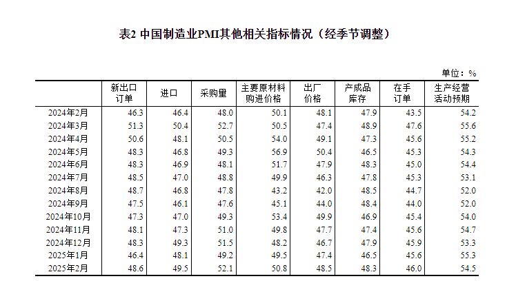 生产指数为52.5%,比上月上升2.7个百分点,表明制造业企业春节后生产活动较快恢复。