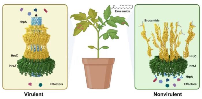 传统认知中,植物抗病代谢物多采用“毒杀”战术,本次最新研究发现,芥酸酰胺像一位精明的“拆弹专家”,它另辟蹊径专门拆除病原菌的“生化武器”——三型分泌系统(T3SS)。三型分泌系统是多种动植物病原细菌用来向宿主细胞分泌毒性蛋白的装置,对致病不可或缺;芥酸酰胺则破坏病原细菌三型分泌系统的装配,将病原细菌变得无害。