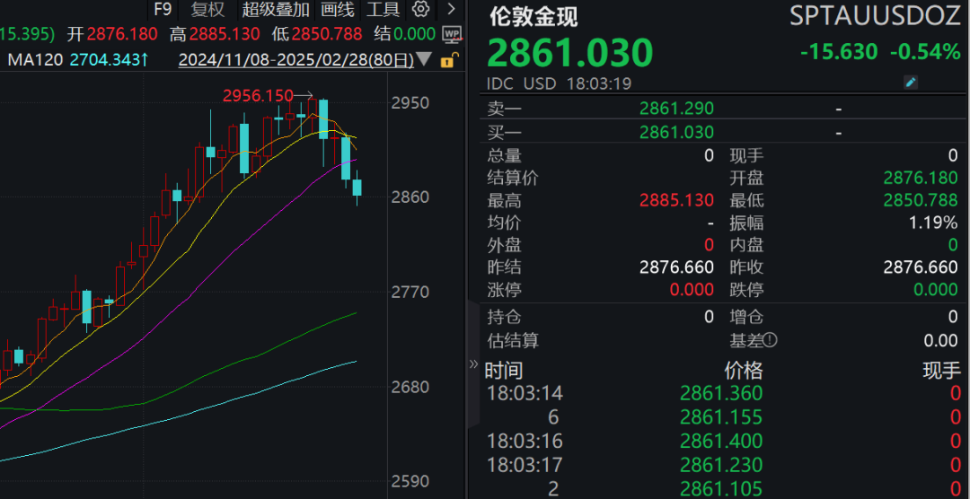 此外,现货黄金跌0.54%报2861美元/盎司。