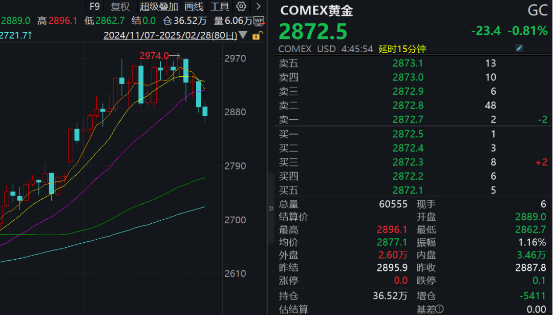 截至周四收盘时,现货黄金跌幅达1.36%,报2876美元/盎司;COMEX黄金期货跌1.46%,报2887.8美元/盎司。今日(周五),金价继续调整,COMEX黄金期货盘中一度跌超1%,现货黄金一度跌近0.9%。截至券商中国记者发稿时,COMEX黄金期货跌0.81%报2872.5美元/盎司。