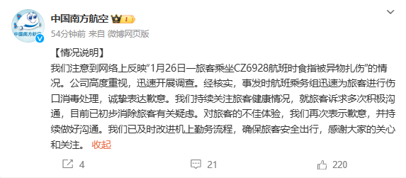 2月28日,中国南方航空发布情况说明,公司注意到网络上反映“1月26日一旅客乘坐CZ6928航班时食指被异物扎伤”的情况。公司高度重视,迅速开展调查。经核实,事发时航班乘务组迅速为旅客进行伤口消毒处理,诚挚表达歉意。公司持续关注旅客健康情况,就旅客诉求多次积极沟通,目前已初步消除旅客有关疑虑。对旅客的不佳体验,公司再次表示歉意,并持续做好沟通。南航称,公司已及时改进机上勤务流程。