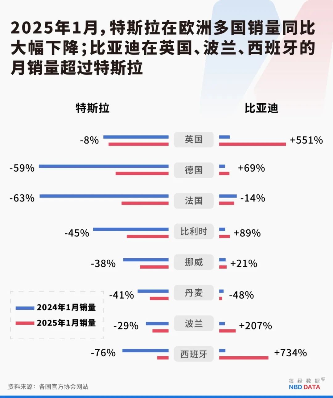2025年1月,特斯拉在中国市场的销量为63238辆,相比2024年1月的71447辆,同比下降11.5%。在美国市场,特斯拉1月销量为49000辆,相比2024年1月的54444辆,同比下降10%。