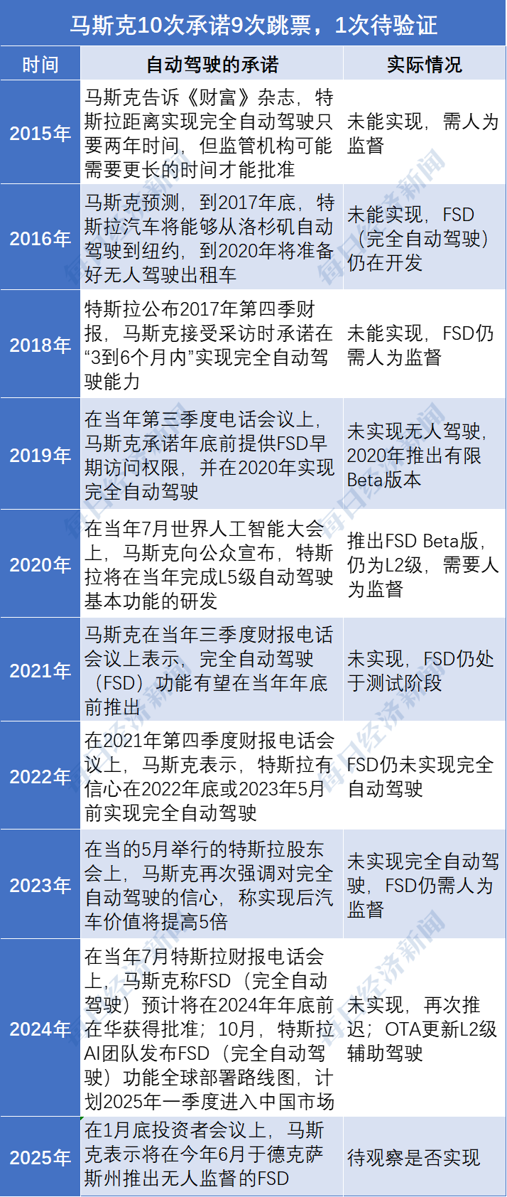 实际上,回顾特斯拉FSD的研发历程,自2015年起,近10年来,特斯拉完全自动驾驶的落地时间一再推迟。马斯克10年10次承诺,至今仍未兑现。