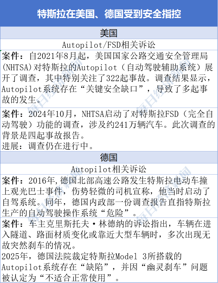 在德国,特斯拉同样面临法律诉讼和监管压力。2025年,德国法院裁定特斯拉Model 3所搭载的Autopilot系统存在“缺陷”,并因“幽灵刹车”问题被认定为“不适合正常使用”。这一判决源于车主克里斯托夫·林德纳的诉讼,他指出车辆在进入隧道、路面材质变化或靠近大型车辆时,多次出现无故突然刹车的情况。
