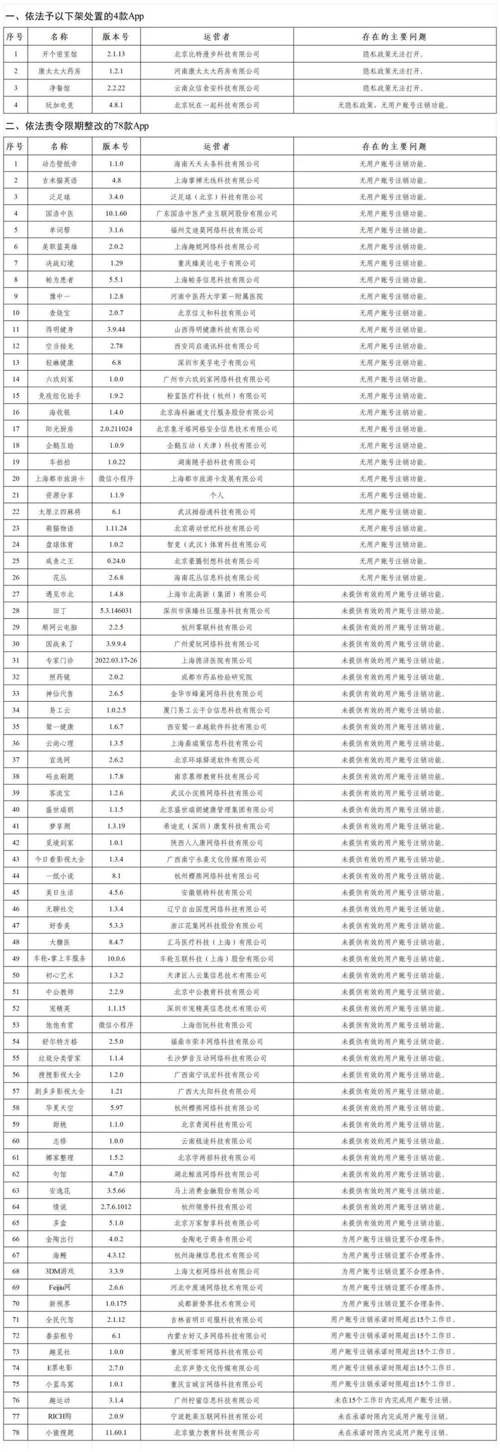 其中,经查,“开个密室馆”等4款App存在未公开收集使用规则问题,违反《中华人民共和国个人信息保护法》等法律法规,依法依规予以下架处置;“动态壁纸帝”等78款App存在未按法律规定提供删除或更正个人信息功能问题,违反《中华人民共和国个人信息保护法》等法律法规,依法依规责令限期1个月完成整改,逾期未完成整改的,依法依规予以下架处置。