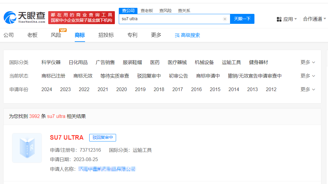 天眼查知识产权信息显示,去年7月,小米科技有限责任公司申请多枚“Xiaomi SU7 Ultra”“Xiaomi Ultra”文字商标以及“Ultra”相关图形商标,国际分类包括运输工具、健身器材、办公用品等,当前部分商标状态为初审公告。此外,济南一公司曾于2023年8月申请注册“SU7 Ultra”商标,国际分类为运输工具,当前商标申请已被驳回复审。