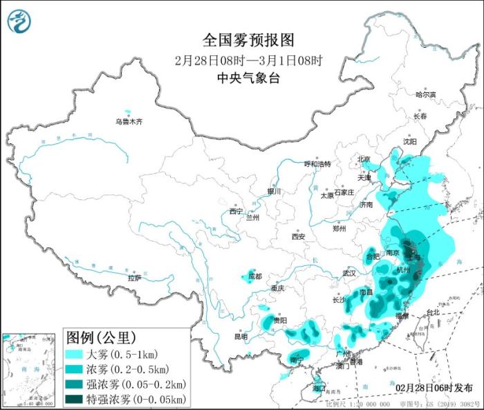 预计,2月28日早晨至上午,山东半岛、江苏、上海、安徽南部、浙江、福建大部、江西北部、广西中部、广东北部、海南岛北部等地的部分地区有大雾,其中江苏中南部、上海、安徽南部、江西北部、浙江中东部、福建北部、广西中部等地的部分地区有能见度低于500米的浓雾,局地有能见度低于200米的强浓雾。