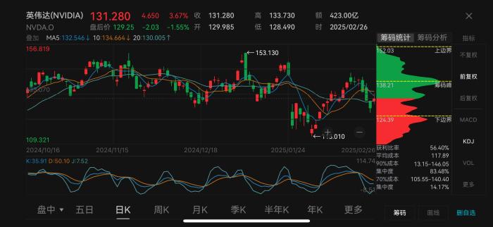 业绩大涨振奋了英伟达股价。截至26日美股收盘,英伟达一转几日来颓势,上涨3.67%报131.28美元。