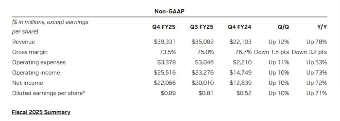 营收方面,同比大幅增长78%至393.31亿美元,高于市场预期的380.5亿美元,也超过英伟达上季度对自己的业绩指引(375亿美元);每股收益方面,非GAAP口径下调整后同比增长71%至0.89美元,高于分析师预期的0.84美元;净利润220.66亿美元,高于彭博综合预期(209亿美元)。