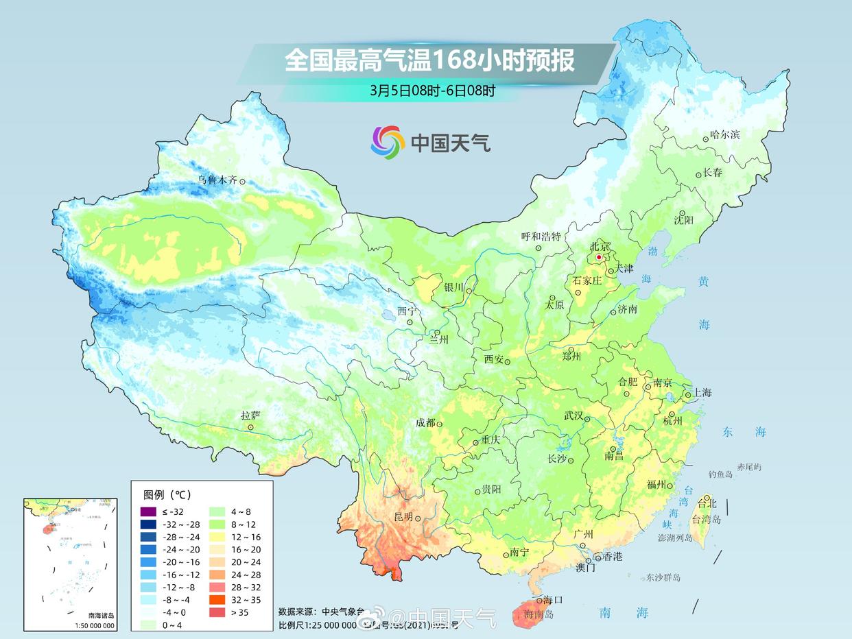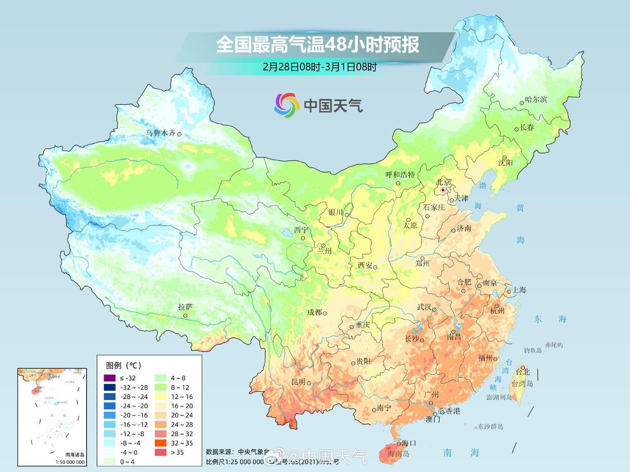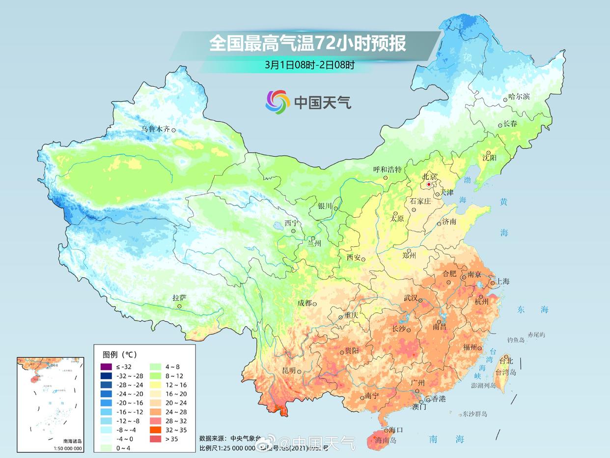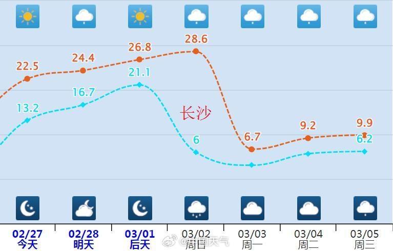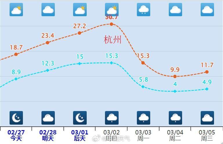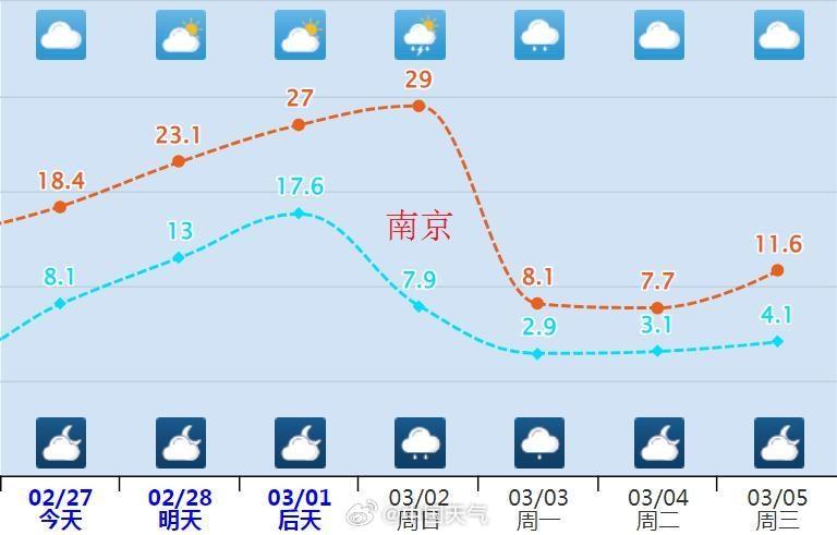 2月27日,据中国天气:本周南方气温疯狂飙升,周末将会来到近期高点!但随着下一股冷空气和降水的到来,气温将会自北向南出现大幅下滑,如同“高台跳水”!