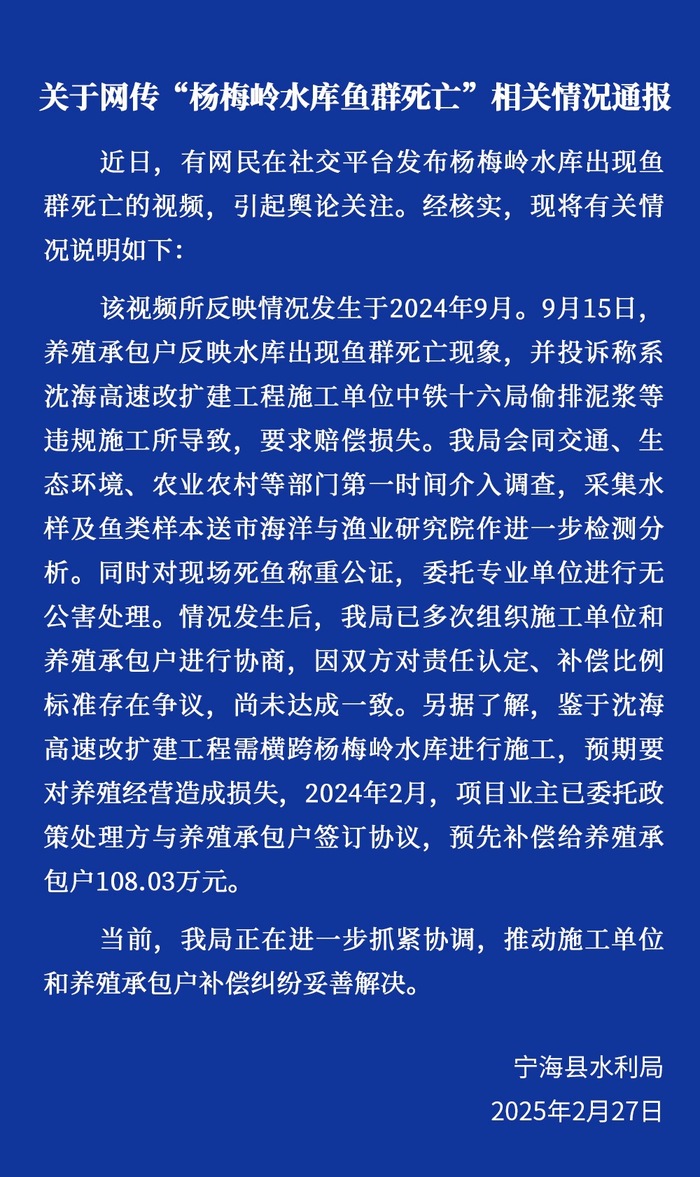 2月25日,有网友反映,宁波市宁海县梅林街道杨梅岭水库,因为施工企业违规排污,导致十万斤鱼死亡,养殖户损失上百万。2月27日,宁海县水利局发布《关于网传“杨梅岭水库鱼群死亡”相关情况通报》称,经核实,该视频所反映情况发生于2024年9月。9月15日,养殖承包户反映水库出现鱼群死亡现象,并投诉称系沈海高速改扩建工程施工单位中铁十六局偷排泥浆等违规施工所导致,要求赔偿损失。宁海县水利局会同交通、生态环境、农业农村等部门第一时间介入调查,采集水样及鱼类样本送市海洋与渔业研究院作进一步检测分析。同时对现场死鱼称重公证,委托专业单位进行无公害处理。情况发生后,宁海县水利局已多次组织施工单位和养殖承包户进行协商,因双方对责任认定、补偿比例标准存在争议,尚未达成一致。另据了解,鉴于沈海高速改扩建工程需横跨杨梅岭水库进行施工,预期要对养殖经营造成损失,2024年2月,项目业主已委托政策处理方与养殖承包户签订协议,预先补偿给养殖承包户108.03万元。当前,宁海县水利局正在进一步抓紧协调,推动施工单位和养殖承包户补偿纠纷妥善解决。