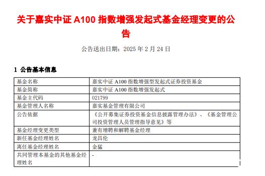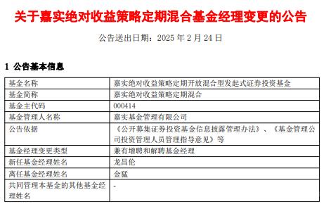公告显示,这四只基金的基金经理职务将分别由龙昌伦和方晗接任。其中,龙昌伦将接管嘉实量化阿尔法混合、嘉实绝对收益策略定期混合A和嘉实中证A100指数增强发起式A三只基金,而方晗则接管嘉实对冲套利定期混合A。