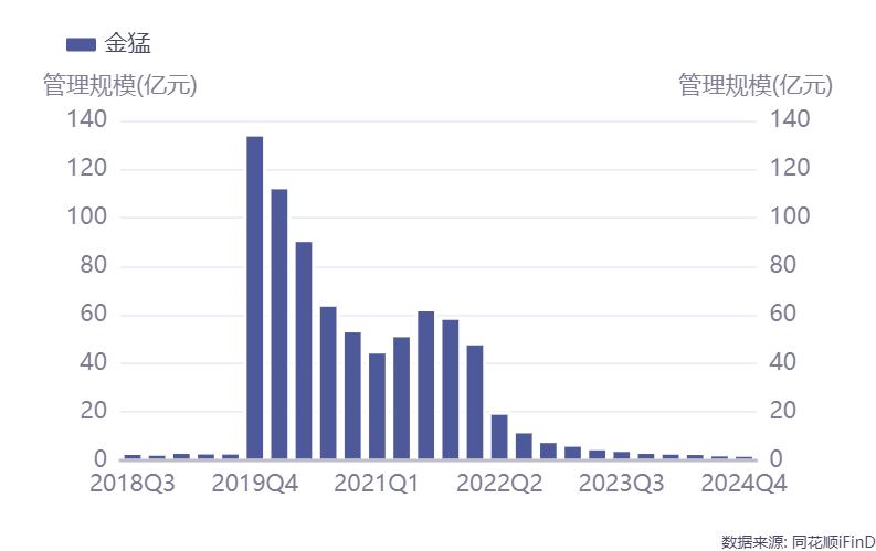 从管理规模来看,金猛的管理规模曾一度达到高峰。据公开数据显示,2019年三季度至2020年一季度,金猛的管理规模一度达到148.22亿元,跻身行业头部。 然而,受业绩波动及市场调整影响,其管理规模持续缩水。2020年二季度规模跌破百亿,截至2022年三季度末,在管规模已降至11.85亿元;而此次卸任前,金猛的在管规模仅为2.26亿元。