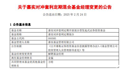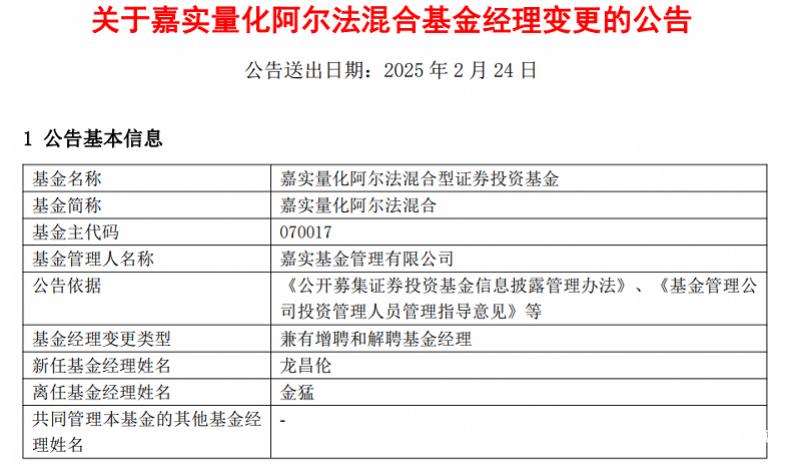 根据嘉实基金发布的公告,金猛卸任其管理的四只基金产品分别为:嘉实量化阿尔法混合、嘉实对冲套利定期混合A、嘉实绝对收益策略定期混合A和嘉实中证A100指数增强发起式A。