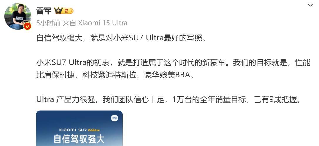 雷军称,小米SU7 Ultra的初衷是打造属于这个时代的新豪车,其性能比肩保时捷、科技紧追特斯拉、豪华媲美BBA。他强调:“Ultra产品力很强,我们团队信心十足,1万台的全年销量目标,已有9成把握。”