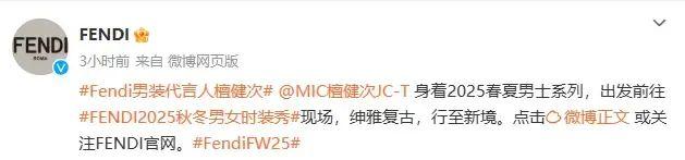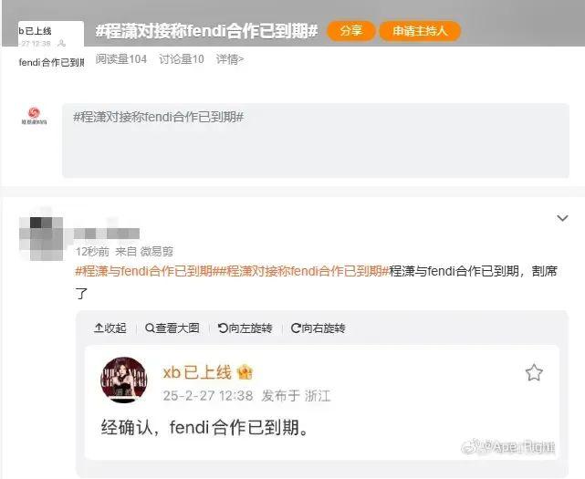 出现争议后,其品牌代言人程潇对接迅速发文称艺人与Fendi合作已到期。
