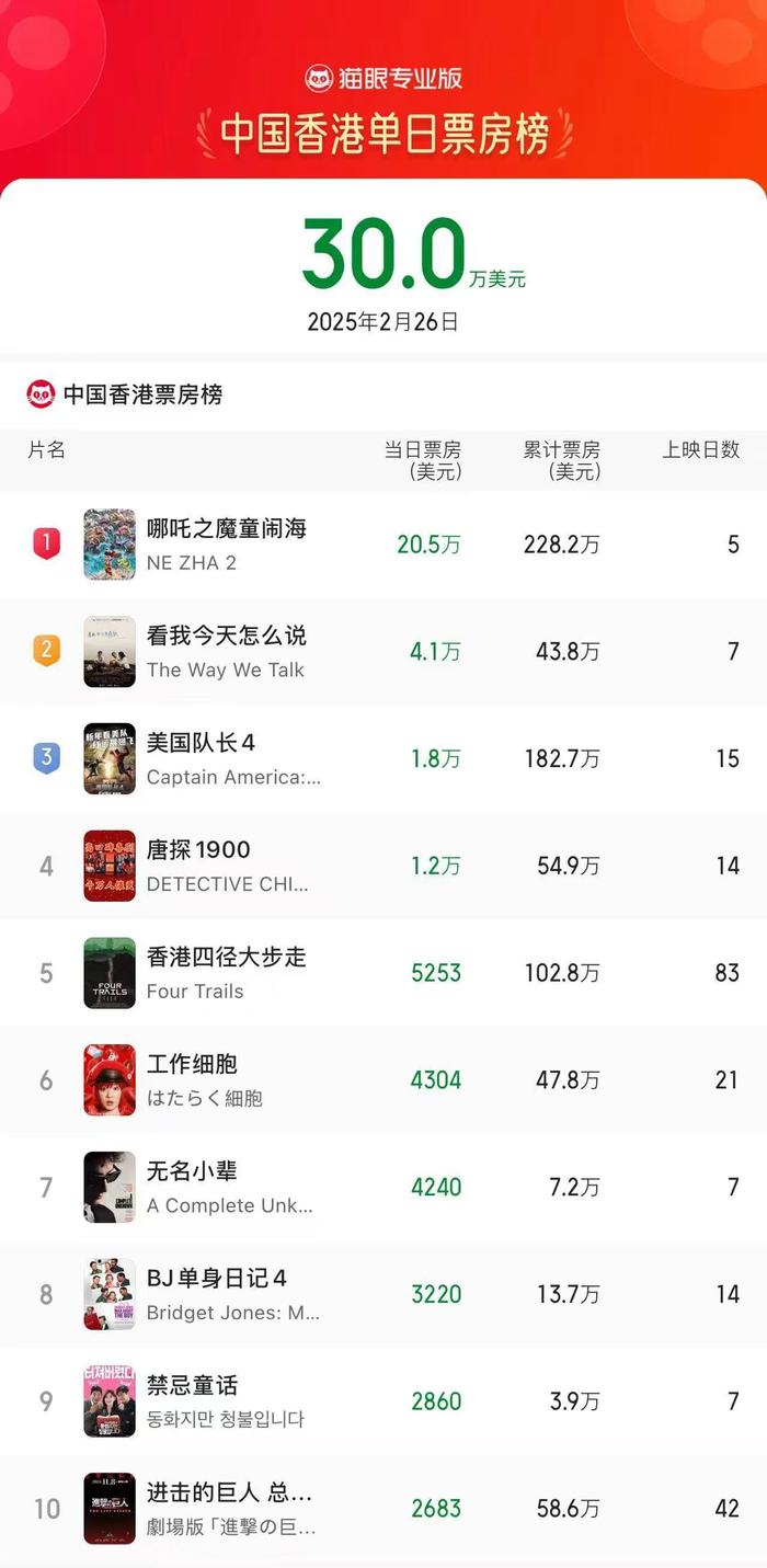 据猫眼专业版全球票房数据显示,电影《哪吒之魔童闹海》连续5天登顶中国香港单日票房榜,累计票房已超228万美元。