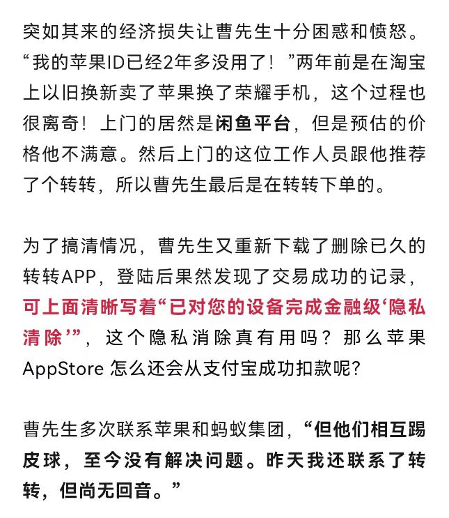 既然支付宝确认曹先生账号没有问题,那就要回到苹果和转转,长期未使用的苹果ID能保障安全吗?一笔笔扣款行为是如何发生的?而且最重要的是,消费者一旦丢失手机或者作二手处理后,发生了异常,能通过什么方式及时止损?