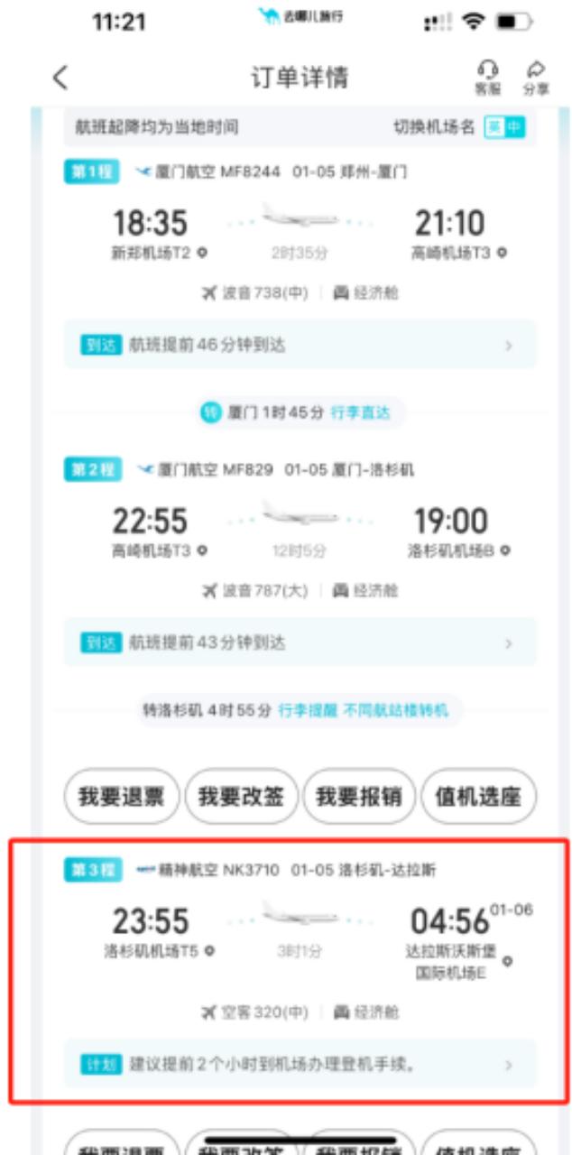 据林女士介绍,2024年11月15日,她通过“去哪儿网”APP为女儿购买了郑州-厦门-洛杉矶-达拉斯的联程机票,总费用14301元。按原计划,2025年1月5日飞抵洛杉矶后,张贝尔应转乘当晚23:55起飞的“精神航空”航班前往达拉斯,由学校老师接机。然而,值机时却突发变故——因航空公司破产,航班已被取消。