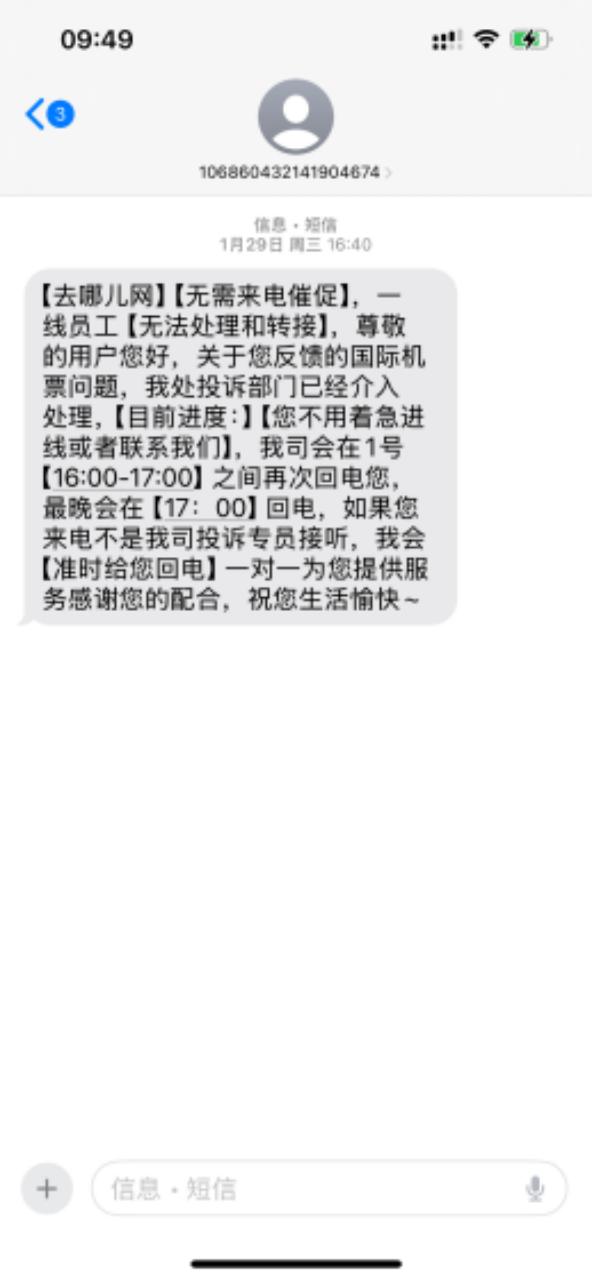 林女士收到的平台短信,此后并未接到去哪网的电话