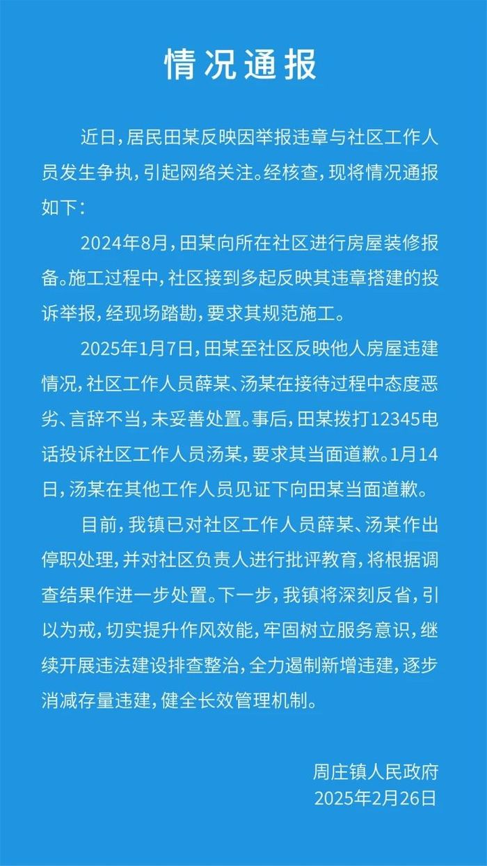2月26日,周庄镇人民政府发布关于“居民反映因举报违章与社区工作人员发生争执”的情况通报称,经核查,2024年8月,田某向所在社区进行房屋装修报备。施工过程中,社区接到多起反映其违章搭建的投诉举报,经现场踏勘,要求其规范施工。2025年1月7日,田某至社区反映他人房屋违建情况,社区工作人员薛某、汤某在接待过程中态度恶劣、言辞不当,未妥善处置。事后,田某拨打12345电话投诉社区工作人员汤某,要求其当面道歉。1月14日,汤某在其他工作人员见证下向田某当面道歉。目前,周庄镇已对社区工作人员薛某、汤某作出停职处理,并对社区负责人进行批评教育,将根据调查结果作进一步处置。