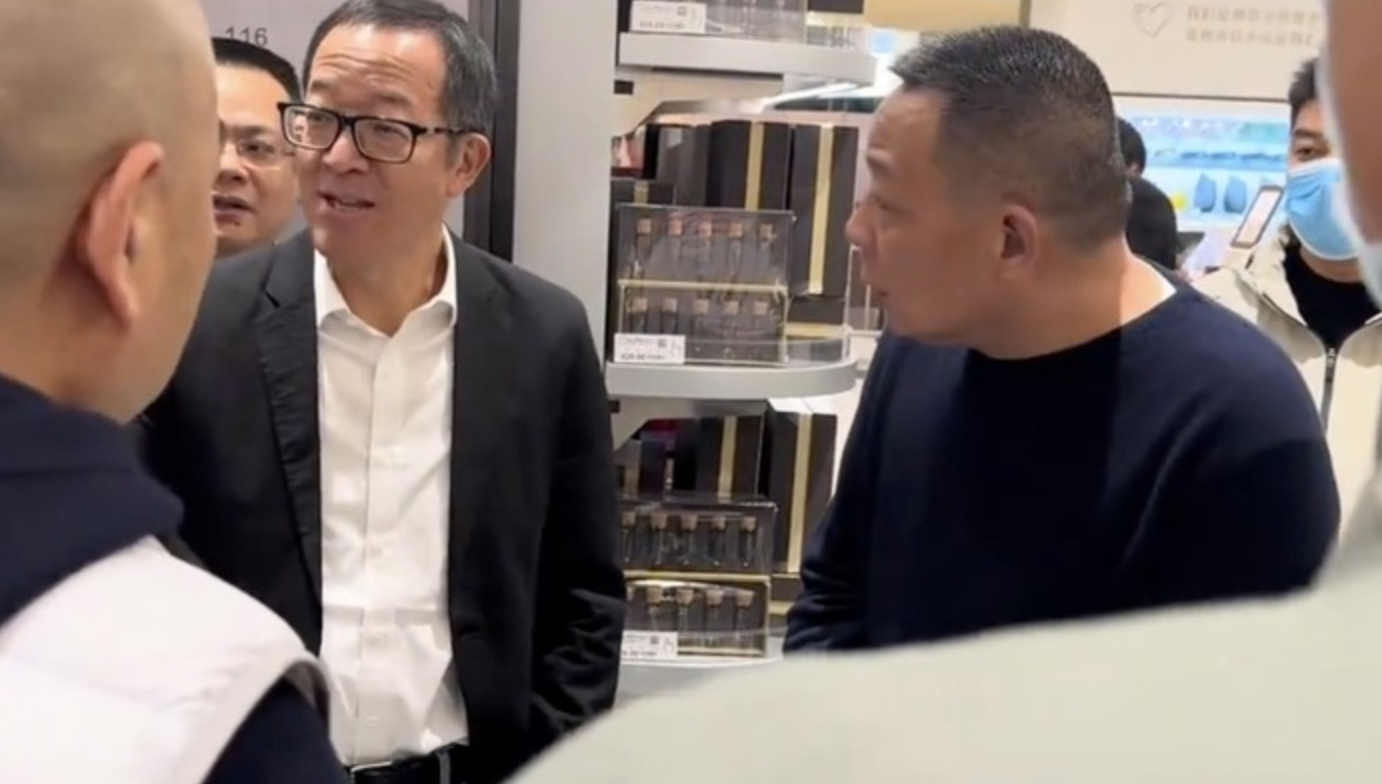 网上视频显示,三人一身休闲装扮,在超市货架食品区、礼品区、酒水区边走边聊。