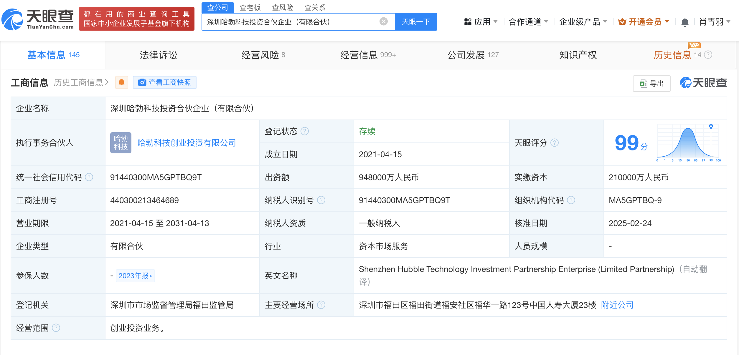 天眼查App显示,近日,深圳哈勃科技投资合伙企业(有限合伙)发生工商变更,出资额由79.8亿人民币增至94.8亿人民币。