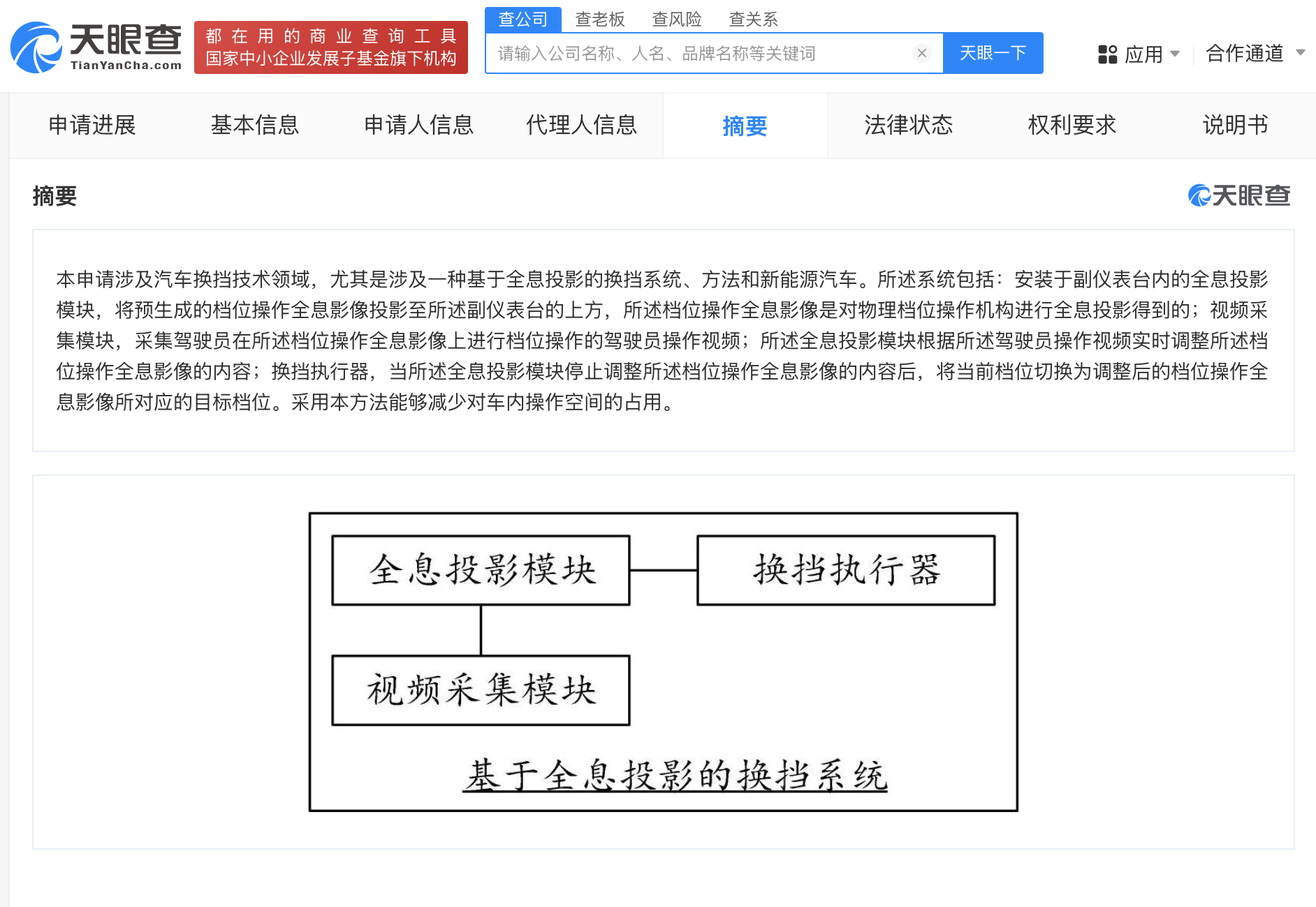 天眼查知识产权信息显示,近日,赛力斯汽车有限公司申请的“基于全息投影的换挡系统、方法和新能源汽车”专利公布。