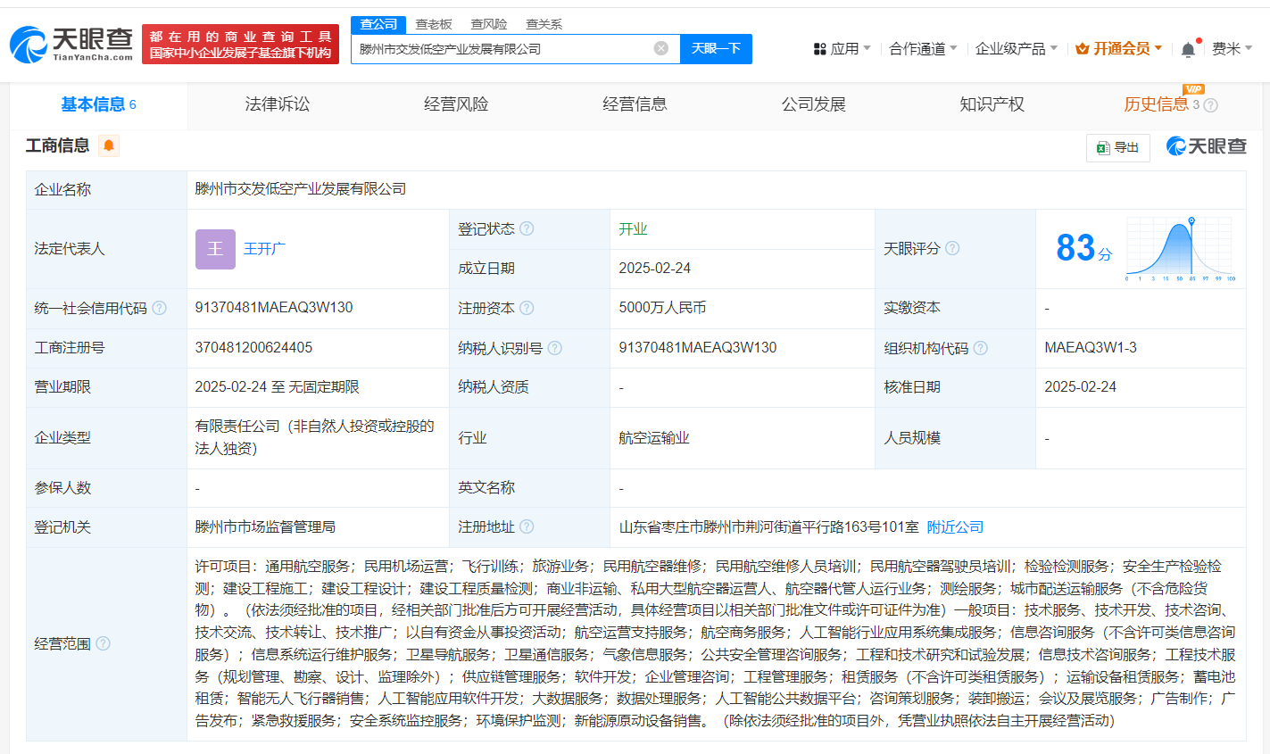 天眼查App显示,近日,滕州市交发低空产业发展有限公司成立,法定代表人为王开广,注册资本5000万人民币,经营范围含通用航空服务、民用机场运营、飞行训练、旅游业务、民用航空器维修、人工智能行业应用系统集成服务等,由滕州市交通发展集团有限公司全资持股。