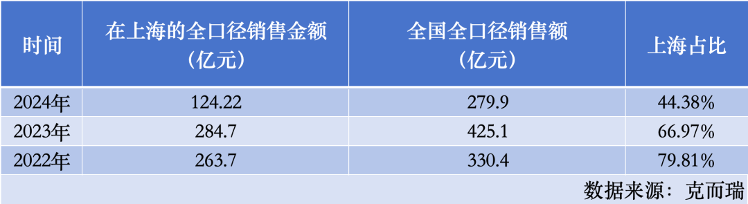 根据克而瑞数据,2022年,象屿地产在上海的全口径销售额为263.7亿元,占总销售额的79.81%,这一比例在次年降至66.97%,2024年进一步下滑,为44.38%。