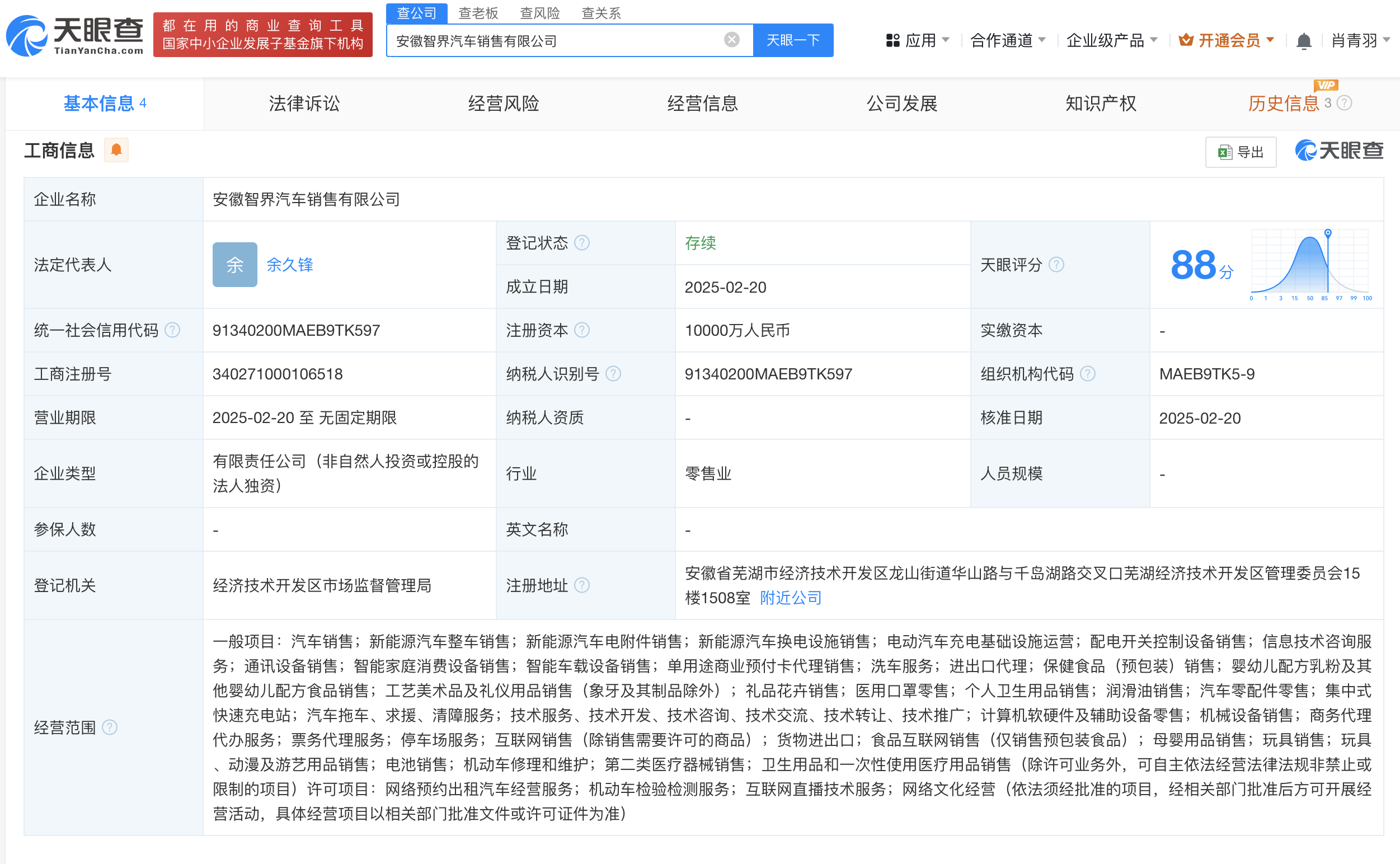 天眼查App显示,近日,安徽智界汽车销售有限公司成立,法定代表人为余久锋,注册资本1亿人民币,经营范围包括汽车销售、新能源汽车整车销售、新能源汽车电附件销售、电动汽车充电基础设施运营、配电开关控制设备销售、信息技术咨询服务、智能家庭消费设备销售等。股权全景穿透图显示,该公司由安徽智界新能源汽车有限公司全资持股,后者为奇瑞汽车股份有限公司全资子公司。