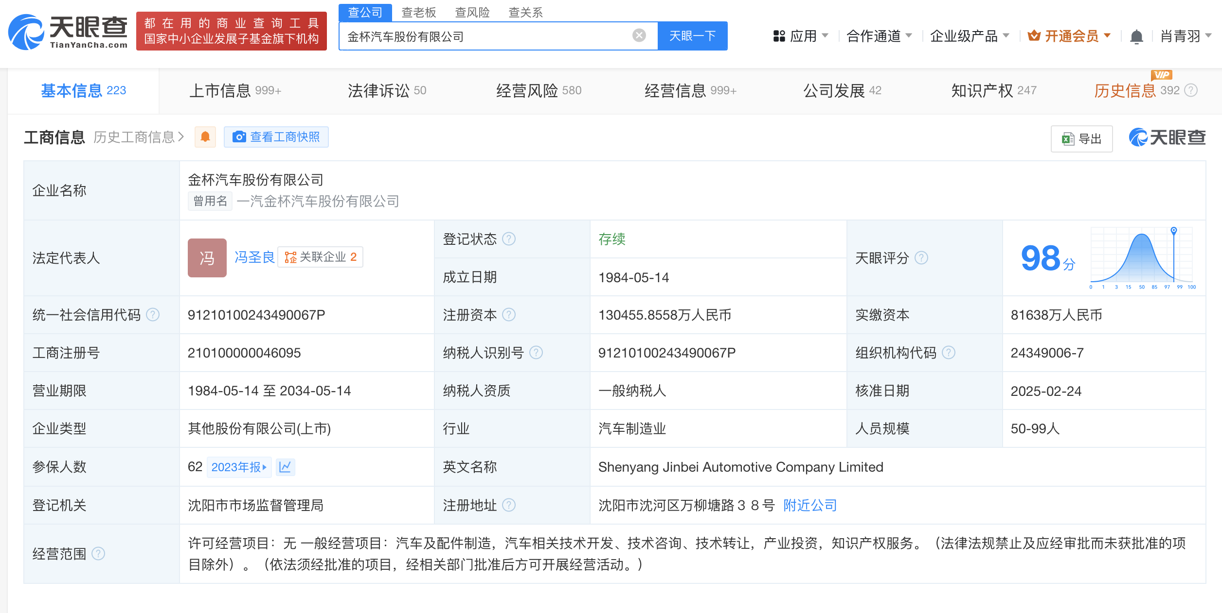 天眼查App显示,近日,金杯汽车股份有限公司发生工商变更,许晓敏卸任法定代表人、董事长、经理,由冯圣良任法定代表人、董事长,丁侃任经理、董事,同时部分高管也发生变更。