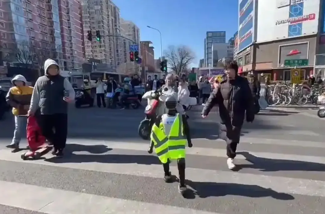 北京海淀区五道口路口,一台身着荧光黄马甲的人形机器人在“指挥交通”,吸引大量网友围观,现场交通秩序一度十分混乱。社交平台视频截图
