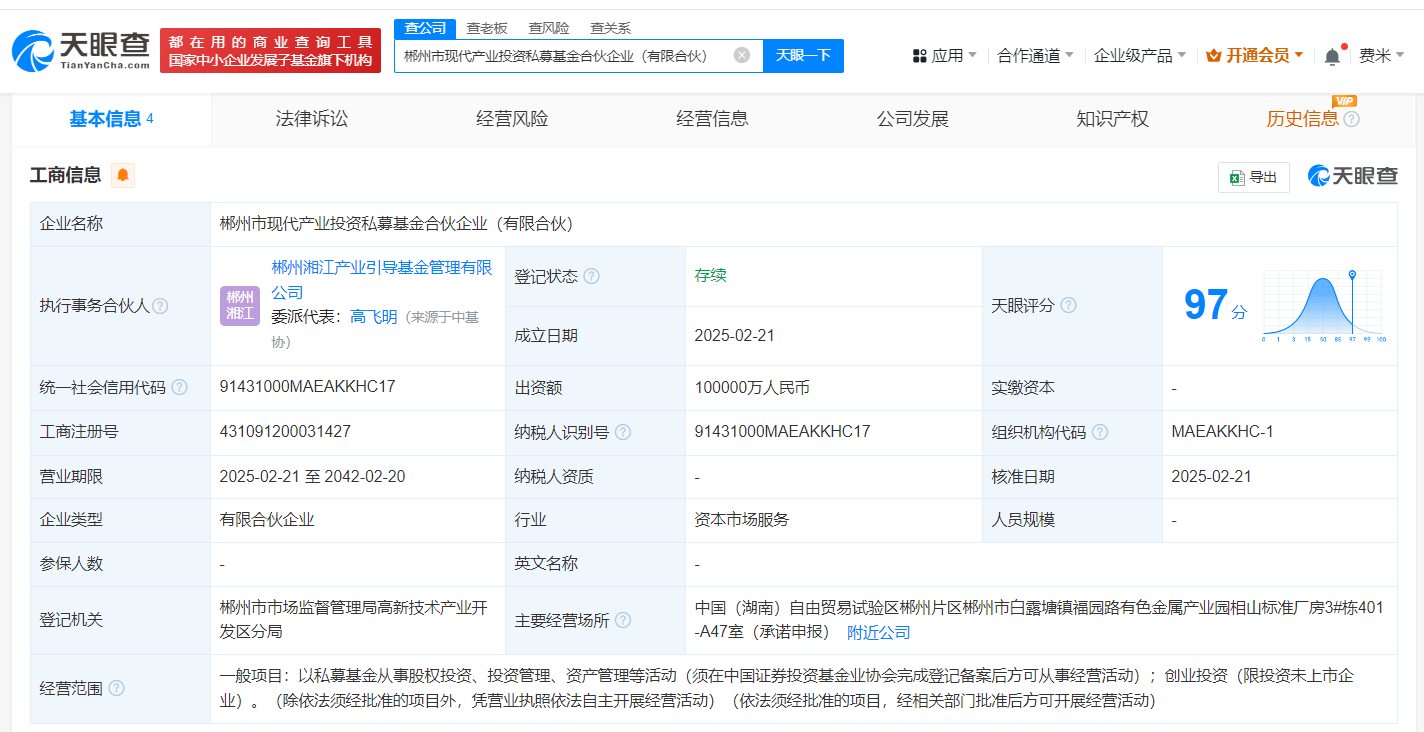 天眼查App显示,近日,郴州市现代产业投资私募基金合伙企业(有限合伙)成立,执行事务合伙人为郴州湘江产业引导基金管理有限公司,出资额10亿人民币,经营范围为以私募基金从事股权投资、投资管理、资产管理等活动,创业投资,由郴州市财政局、郴州湘江产业引导基金管理有限公司共同出资。