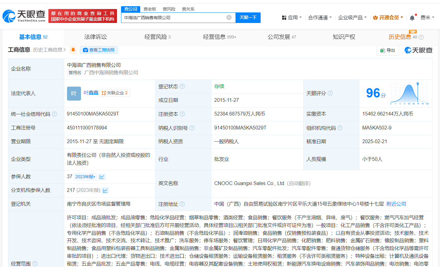天眼查App显示,近日,中海油广西销售有限公司发生工商变更,注册资本由约2.1亿人民币增至约5.2亿人民币,增幅约146%。