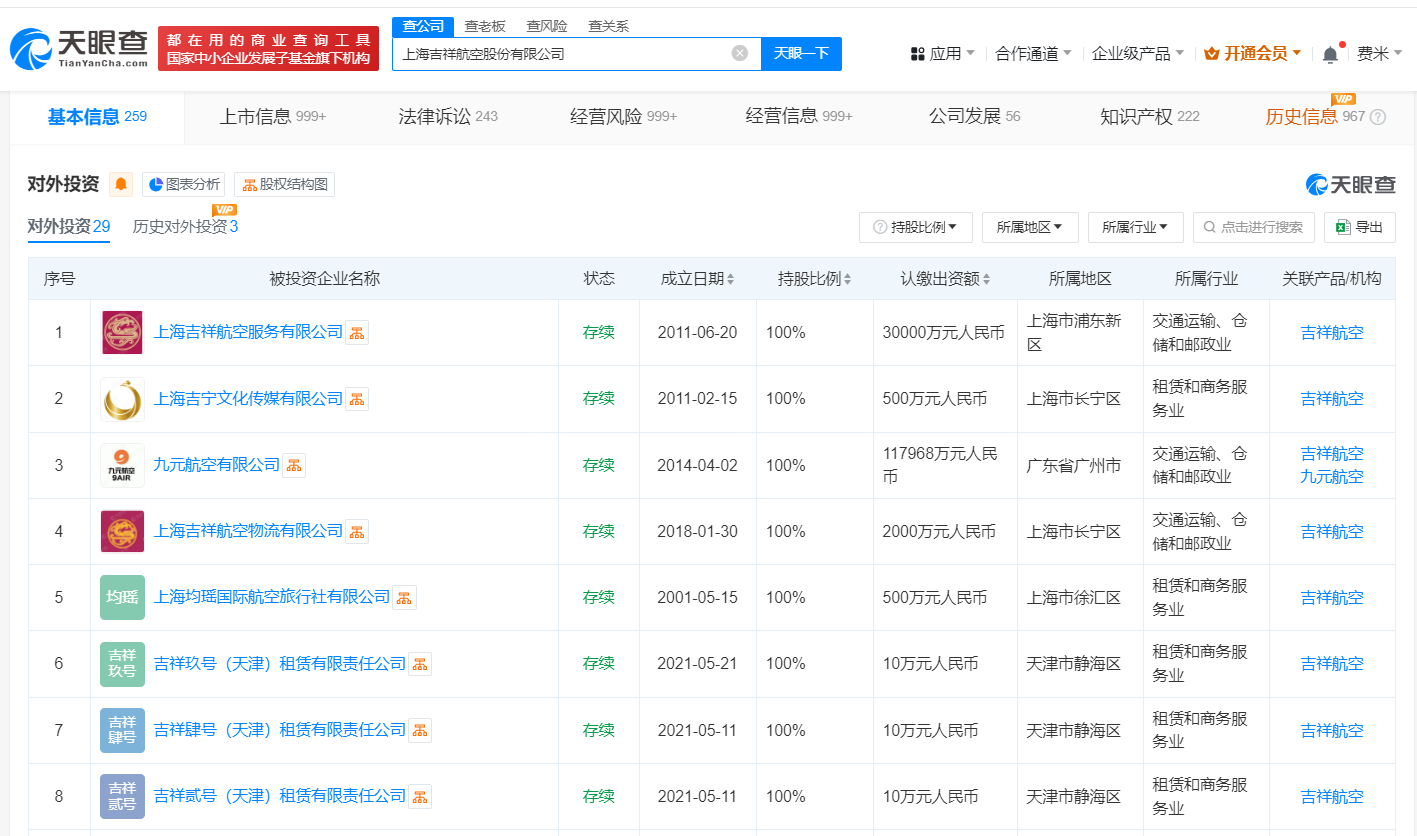天眼查App显示,吉祥航空关联公司上海吉祥航空股份有限公司成立于2006年3月,法定代表人为王均金,注册资本约22亿人民币,由上海均瑶(集团)有限公司、东方航空产业投资有限公司、香港中央结算有限公司等共同持股。对外投资信息显示,该公司对外投资29家公司,其中28家为存续状态,包括上海吉祥航空服务有限公司、上海吉宁文化传媒有限公司、上海吉祥航空物流有限公司等。风险信息显示,该公司曾涉及多起诉讼案件,包括航空旅客运输合同纠纷、侵权责任纠纷等。