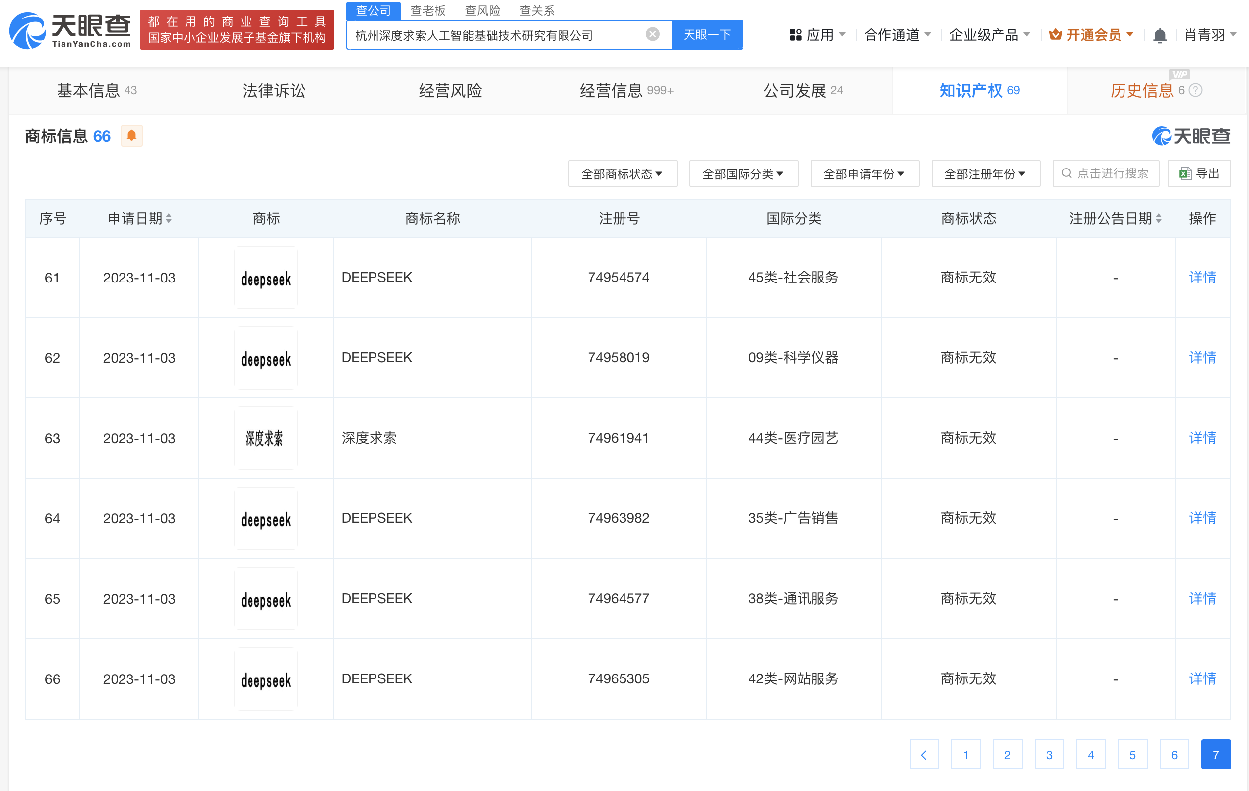 天眼查App显示,“DeepSeek”关联公司杭州深度求索人工智能基础技术研究有限公司成立于2023年7月,法定代表人为裴湉,注册资本1000万人民币,经营范围包括信息系统集成服务、人工智能应用软件开发、信息技术咨询服务等,由梁文锋及其名下宁波程恩企业管理咨询合伙企业(有限合伙)共同持股。知识产权信息显示,该公司已成功注册多枚“DEEPSEEK”商标,最早申请日期为2023年11月。除该公司外,已有多家企业于近期申请注册多枚“DEEPSEEK”商标。