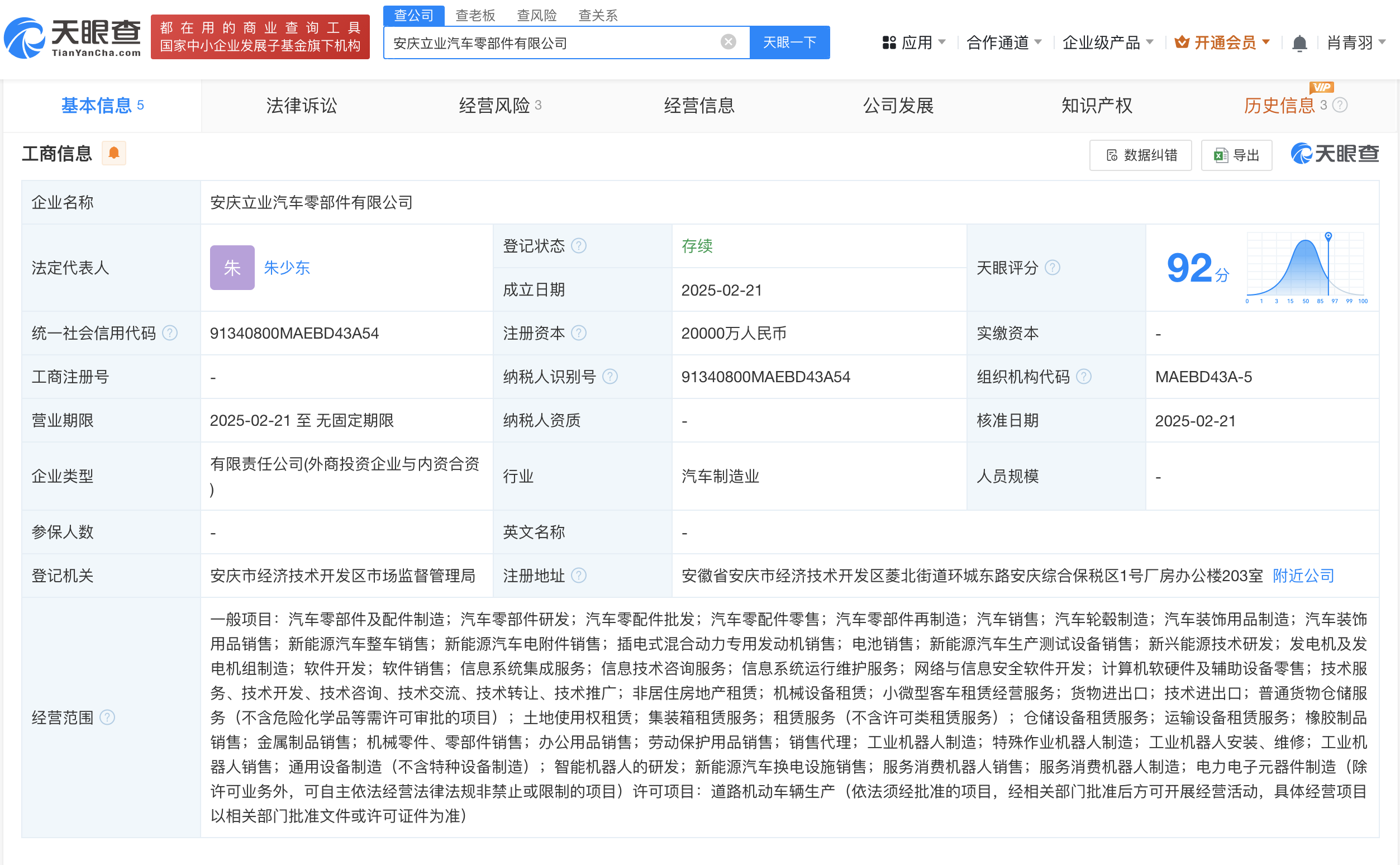 天眼查App显示,近日,安庆立业汽车零部件有限公司成立,法定代表人为朱少东,注册资本2亿人民币,经营范围包括汽车零部件及配件制造、汽车零部件研发、汽车零部件再制造、汽车销售、新能源汽车生产测试设备销售、新兴能源技术研发、工业机器人制造、特殊作业机器人制造等。股东信息显示,该公司由奇瑞汽车股份有限公司及旗下芜湖普瑞汽车投资有限公司共同持股。